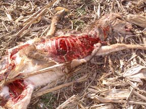 The top picture shows a den hole above a slough on one of the farms I hunt, the next picture is a fox print in the mud of the slough, and at bottom the carcass of a deer predated upon just one field over.