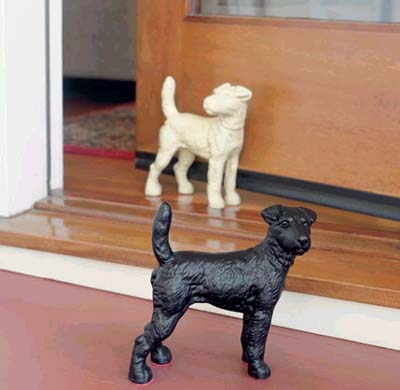 This cast iron terrier is sold by Restoration Hardward and is the hardest working terrier in the world. It's "work" is to hold open doors on breezey days.