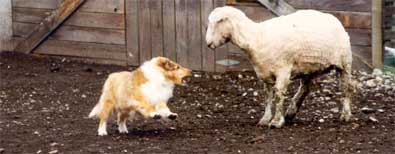 A young sheltie ties to convince a much larger sheep that it is serious and up to the task.