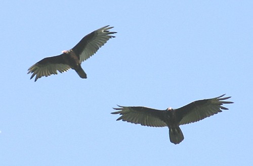 You will rarely see Turkey Vulture flying in the early morning, as they launch themselves from trees, cliffs, powerlines, barns and silos only after the morning air has warmed up. A Vulture will fly into a thermal uplift, ride it up in a wide circle, and then glide across the sky at speeds of up to 50 miles per hour gently falling until they reach the next thermal which they in turn ride up again -- repeating the process adinfinitum. On a good day, a Turkey Vulture can glide for four of five hours without flapping its wings.