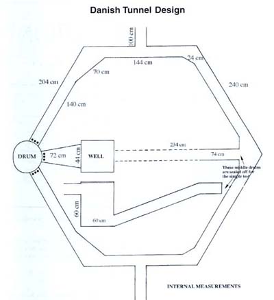 The drum on the far right is rotated so that the "quarry" (a live fox or badger) can escape out a side door and run from down the tunnel to another drum (not shown) which is then rotated half way to put bars between the dog and the game.