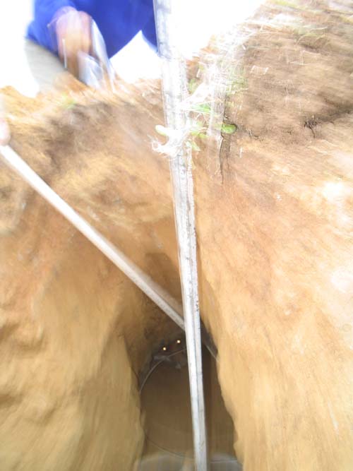 In the picture at top, the snare is set, with the digging bar placed vertically in the pipe to slow the fox down a bit and steer it into the snare.