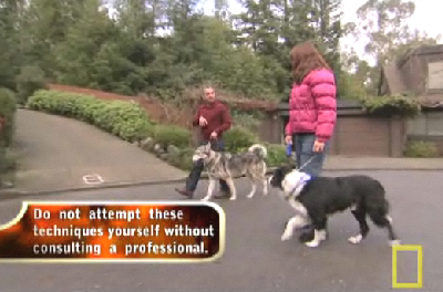 Look at the picture above. This is the sixth second of the video. The Husky has turned away from Millan and towards the Border Collie, with mouth open and ears up and forward -- a classic sign of aggression. Millan has tightened the leash, given a "tssst" sound, and he has also given a light "heal tap" to the back of the dog as a correction. This is often described as Millan "kicking" the dog, but in fact this heel tap is designed to do nothing more than send a corrective message. Notice that the dog's body is not moved at all by the heel tap -- it a simple bump, and nothing more.